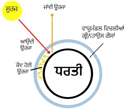 ਸਾਡੀ ਜੀਵਨ ਦਾਤੀ ਧਰਤੀ ਦਿਨੋ ਦਿਨ ਮਨੁੱਖੀ ਕਿਰਿਆਵਾਂ ਰਾਹੀਂ ( ਖ਼ਾਸ ਤੌਰ ਤੇ ਕੋਲੇ, ਤੇਲ ਤੇ ਗੈਸ ਦੇ ਬਲਣ ਨਾਲ) ਵਾਯੂ-ਮੰਡਲ ਵਿੱਚ ਛੱਡੀਆਂ ਜਾ ਰਹੀਆਂ ਗਰੀਨਹਾਊਸ ਗੈਸਾਂ ਦੀ ਵਜ੍ਹਾ ਕਰਕੇ ਗਰਮ ਹੋ ਰਹੀ ਹੈ। ਸੌਖੇ ਜਿਹੇ ਤਰੀਕੇ ਨਾਲ ਸਮਝਣਾ ਹੋਵੇ ਤਾਂ ਧਰਤੀ ਤੱਕ ਪਹੁੰਚਦੀ ਸੂਰਜ ਦੀ ਤਪਸ਼ ਦਾ 90% ਹਿੱਸਾ ਸਮੁੰਦਰਾਂ ਵਿੱਚ ਸਮਾ ਜਾਂਦਾ ਹੈ ਤੇ ਬਾਕੀ ਬਚਿਆ 10% ਧਰਤੀ ਦੀ ਤਹਿ ਤੋਂ ਟਕਰਾ ਕੇ ਜਦੋਂ ਵਾਯੂ-ਮੰਡਲ ਵਿੱਚ ਮੁੜ ਪਰਤਨ ਦੀ ਕੋਸ਼ਿਸ਼ ਕਰਦਾ ਹੈ ਤਾਂ ਵਾਤਾਵਰਣ ਵਿੱਚ ਗਰੀਨਹਾਊਸ ਗੈਸਾਂ ਦੀ ਬਹੁਤਾਤ ਹੋਣ ਕਾਰਨ ਤਪਸ਼ (ਊਰਜਾ) ਧਰਤੀ ਦੁਆਲੇ ਬਣੇ ਗੈਸਾਂ ਦੇ ਗੁਬਾਰੇ ਵਿੱਚ ਇੱਕ ਤਰ੍ਹਾਂ ਕੈਦ ਹੋਣ ਕਰਕੇ ਬਾਹਰ ਨਹੀ ਨਿਕਲ ਪਾਉਂਦੀ ਤੇ ਧਰਤੀ ਦਾ ਤਾਪਮਾਨ ਵਧਣ ਲੱਗਦਾ ਹੈ।